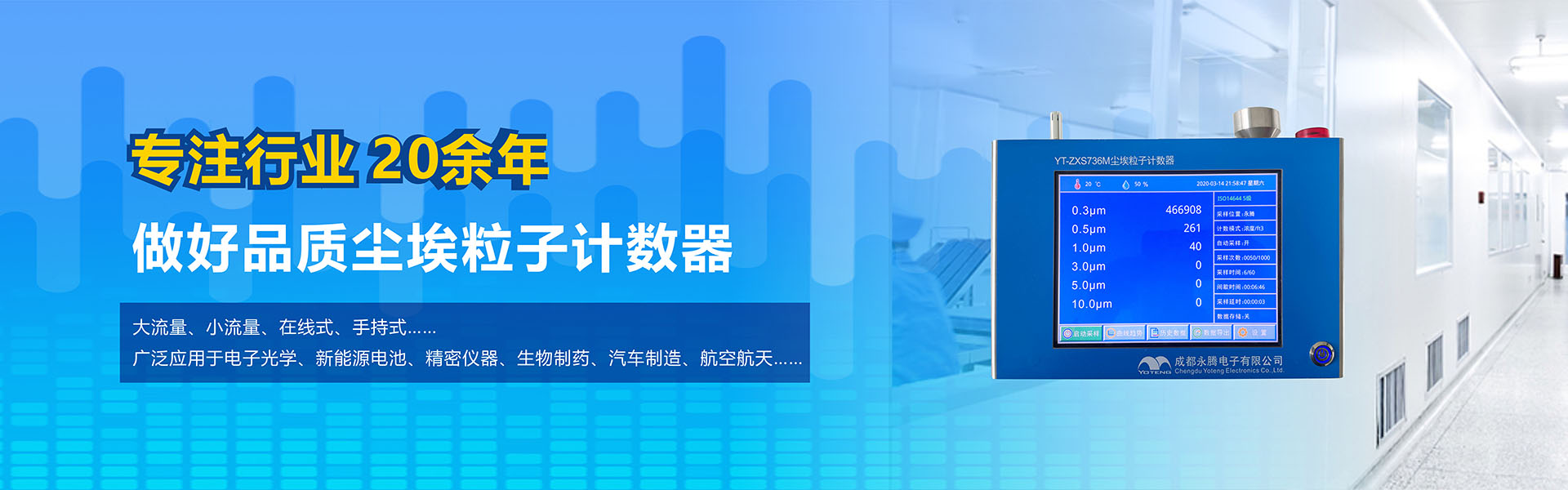成都永騰電子有限公司位于成都市國家經濟技術開發區,是一家專業從事環境空氣監測儀器研發、生產、銷售于一體的高科技企業。產品涵蓋空氣檢測儀器、潔凈間在線塵埃粒子計數器監測系統、大氣顆粒物監測微站系統、電化學分析儀器、實驗室設備等產品。